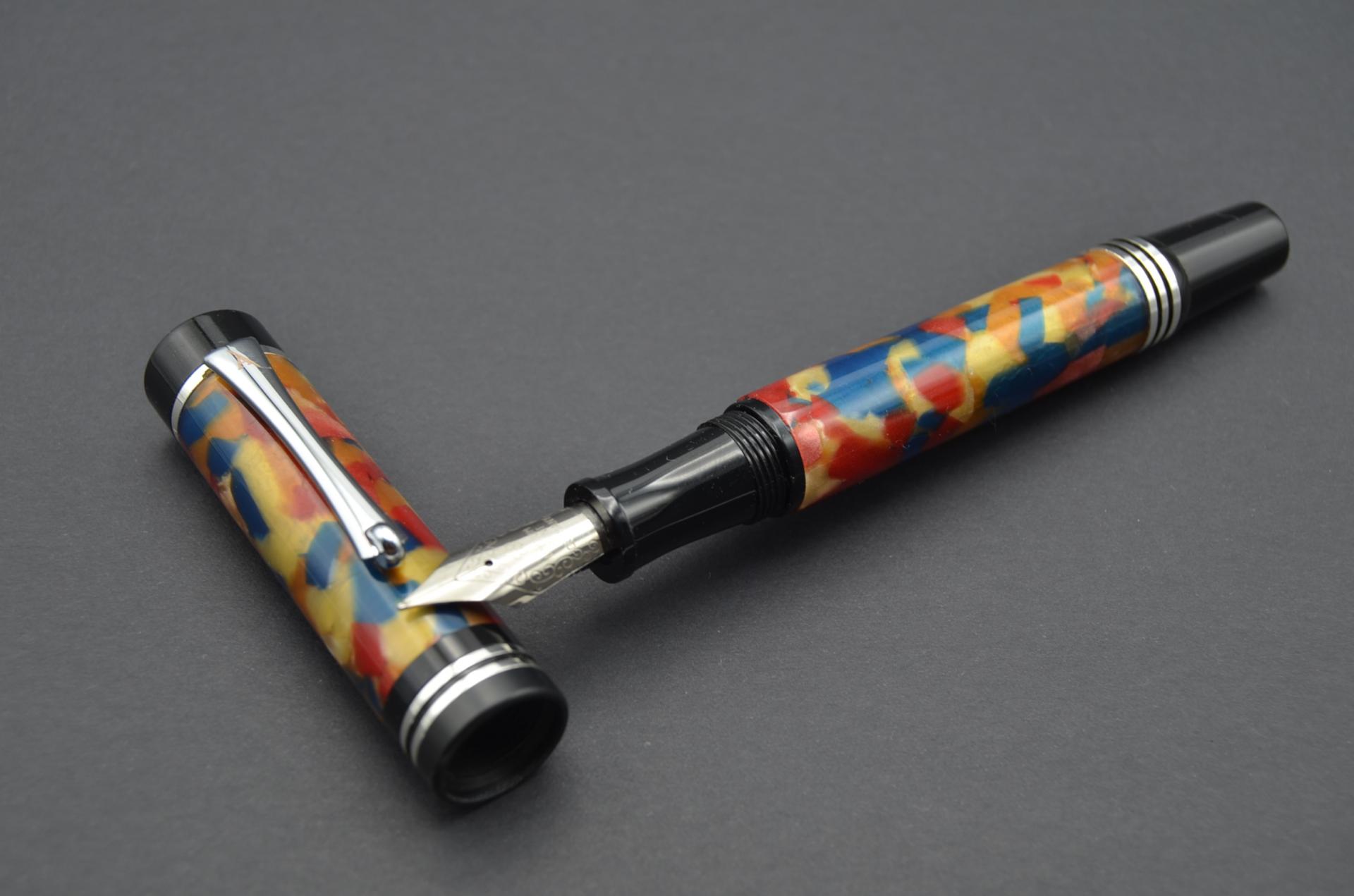 Estilográfica torneada a mano en resina acrílica, sistema de carga de tinta mediante convertidor o cartuchos universales, plumín de acero #6. F