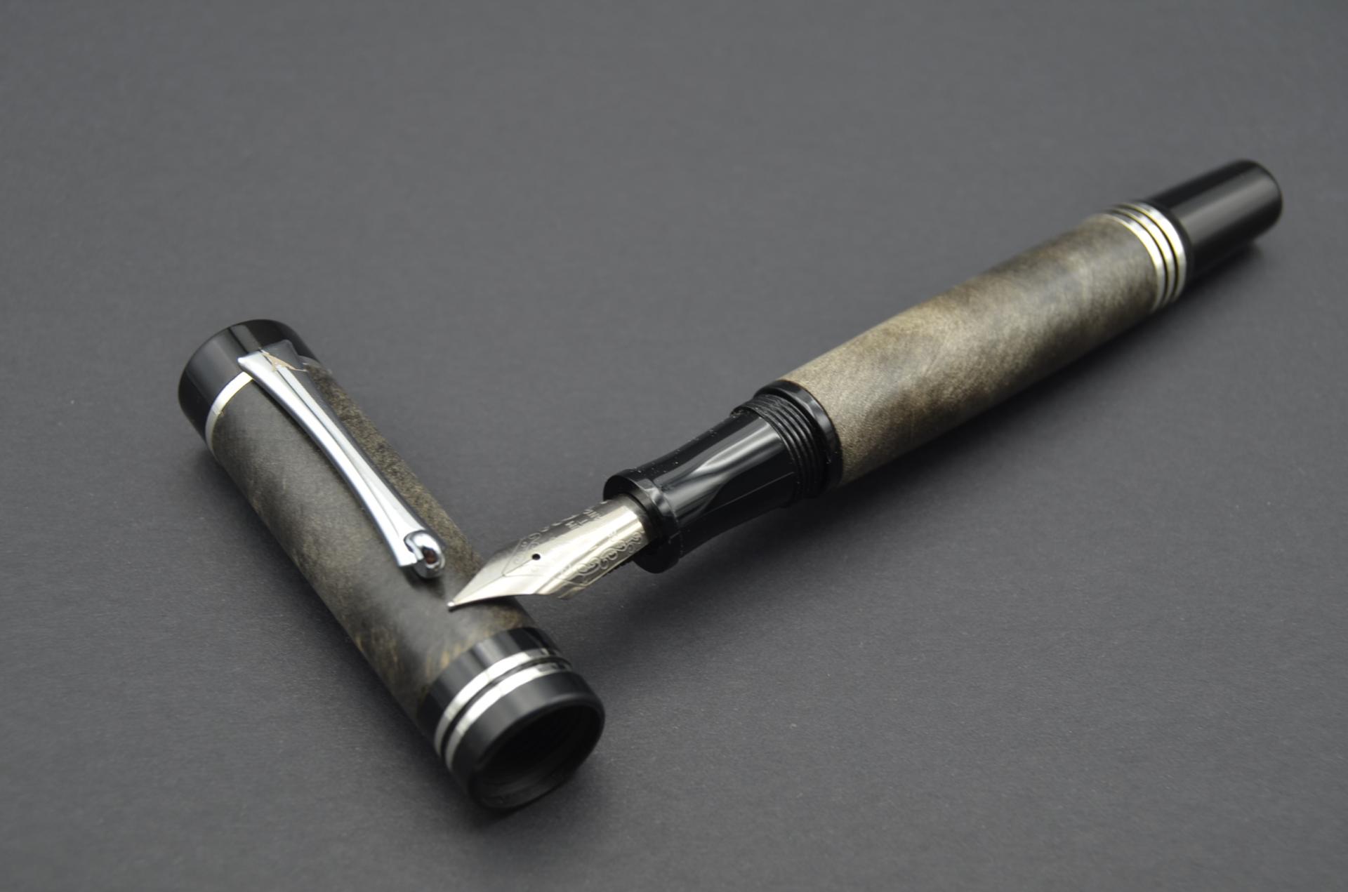 Estilográfica torneada a mano en madera de raiz de buckeye gris, sistema de carga de tinta mediante convertidor o cartuchos universales, plumín de acero #6. punto F
