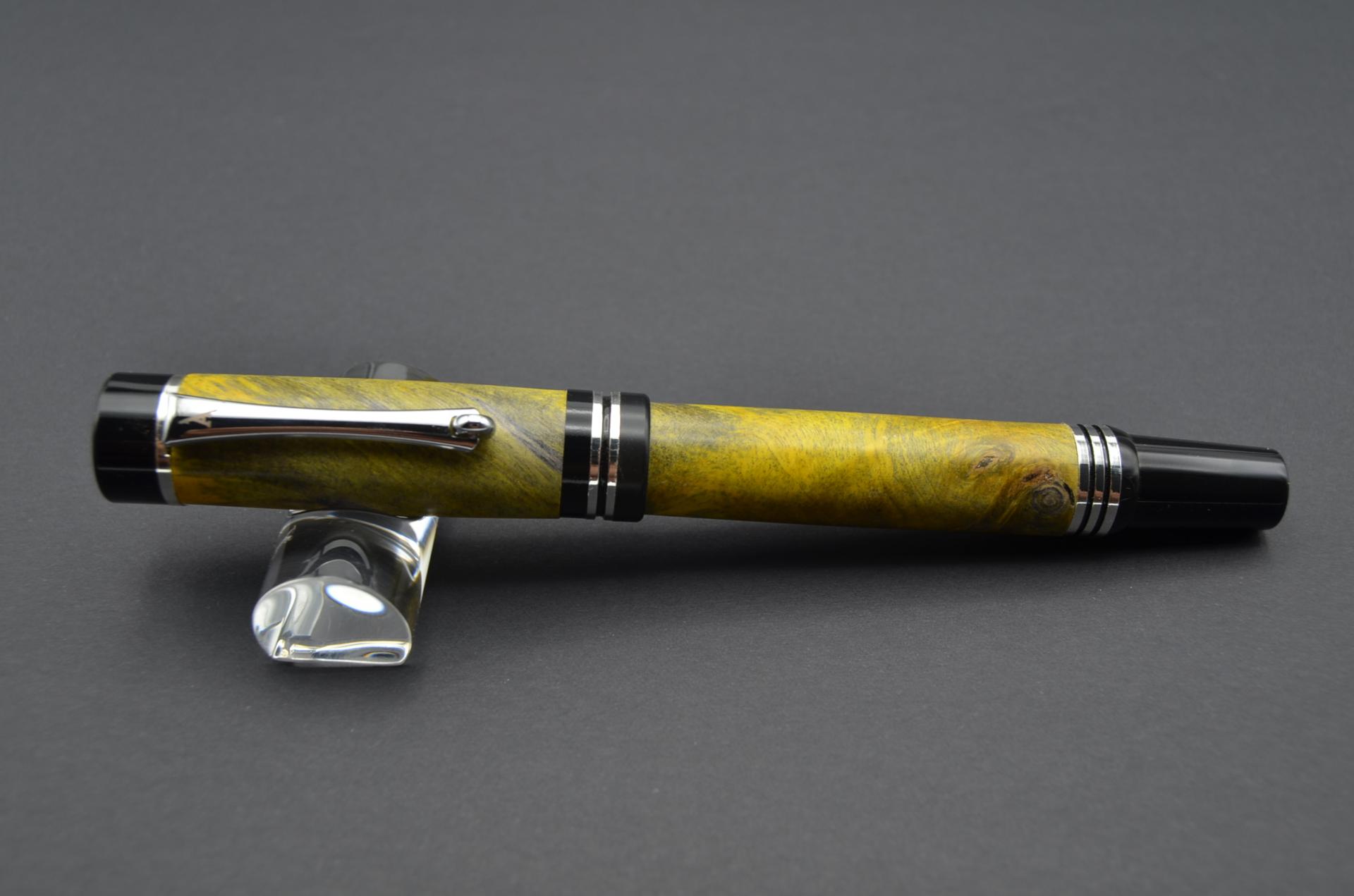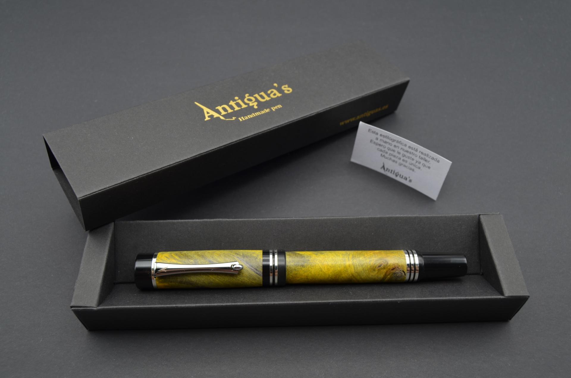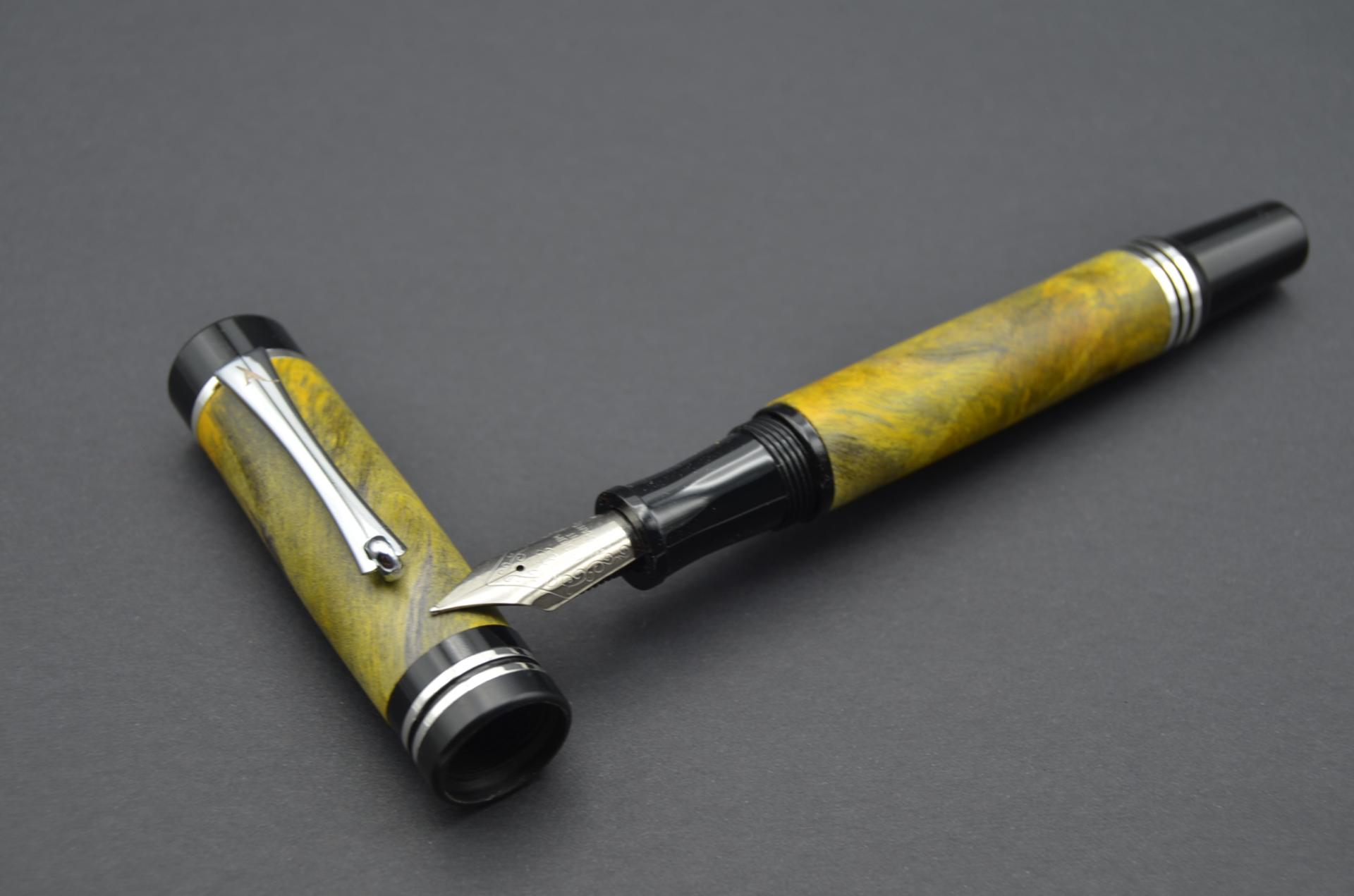 Estilográfica torneada a mano en madera de raiz de buckeye amarillo, sistema de carga de tinta mediante convertidor o cartuchos universales, plumín de acero #6. punto F
