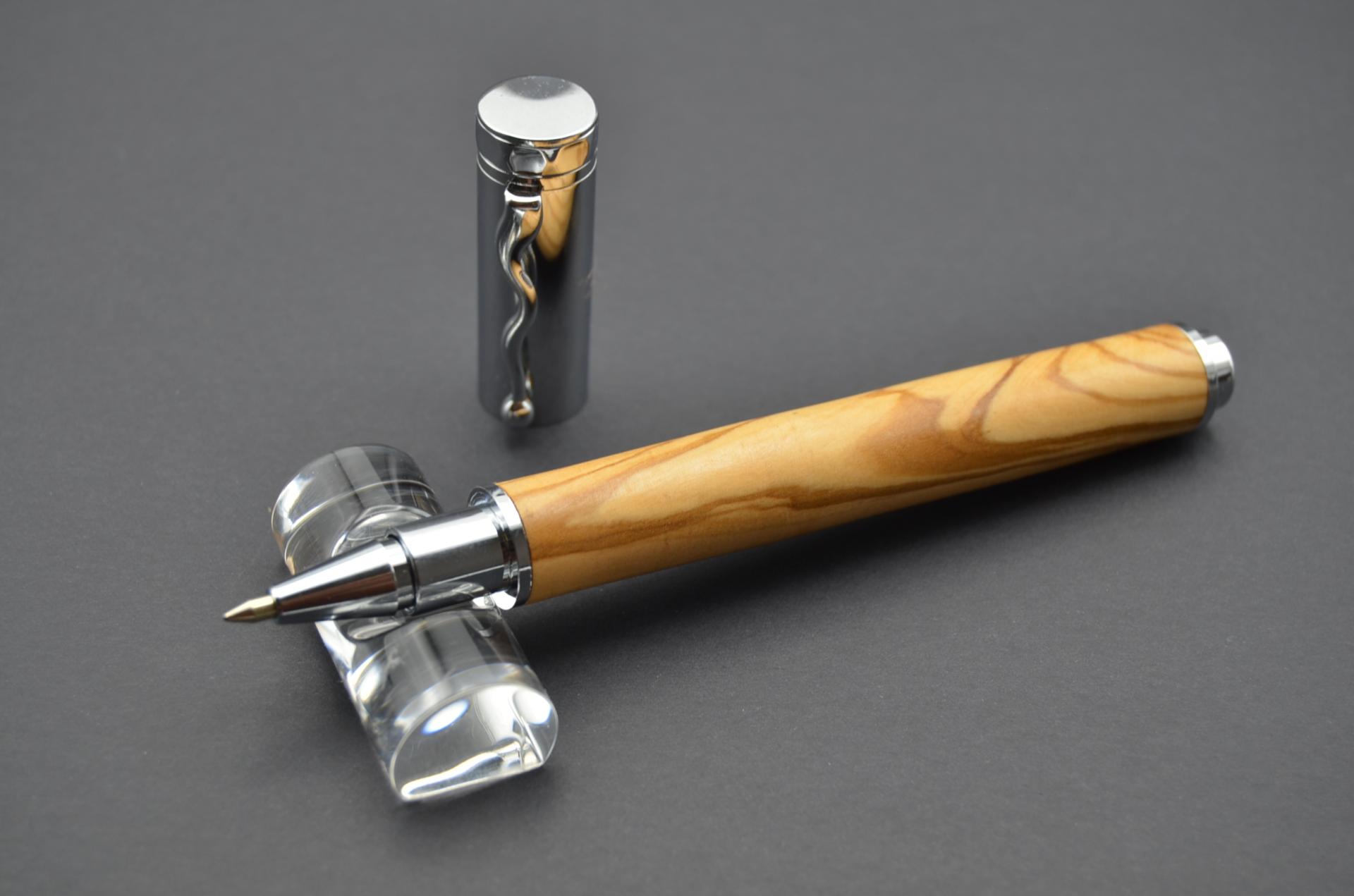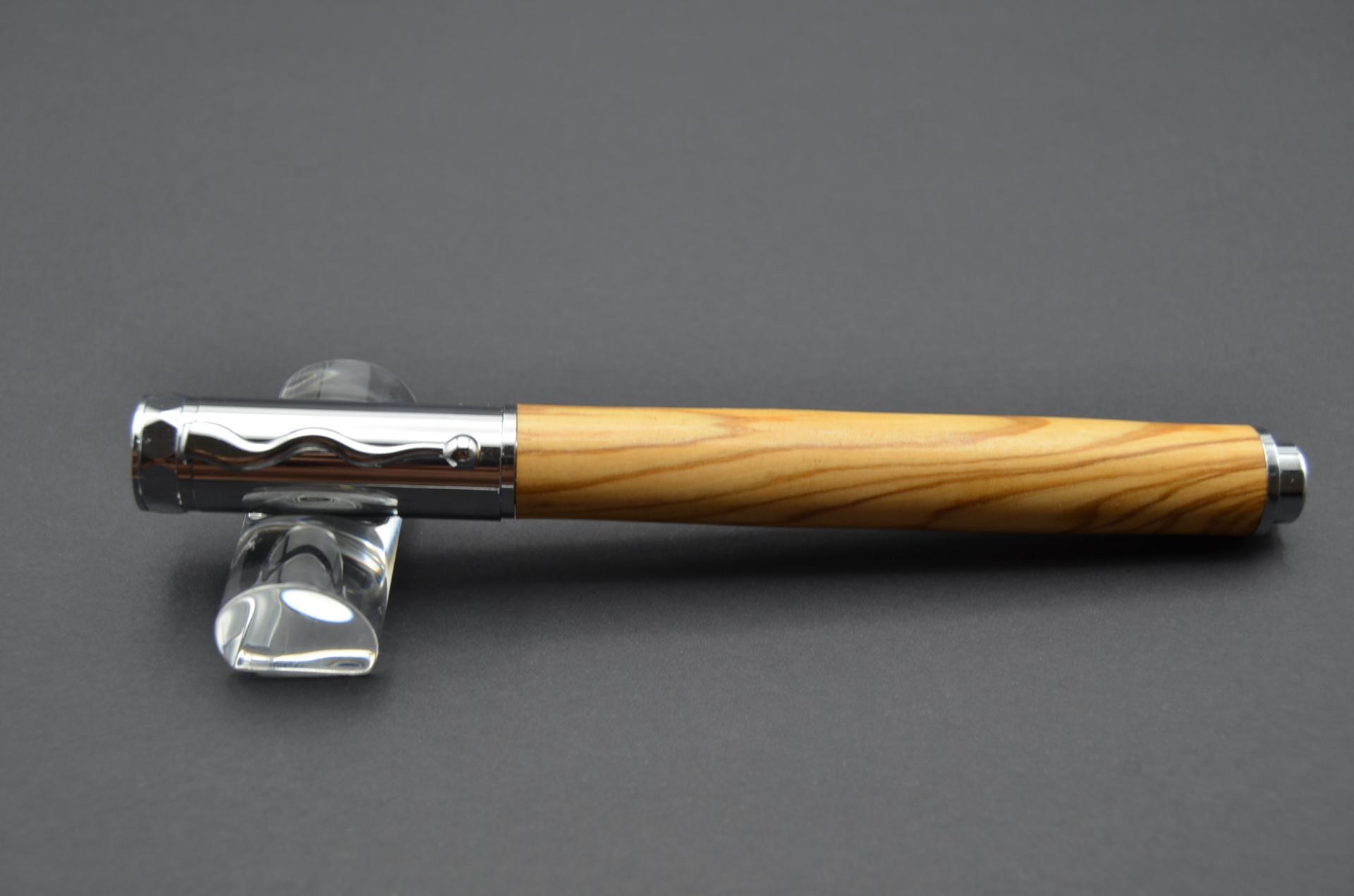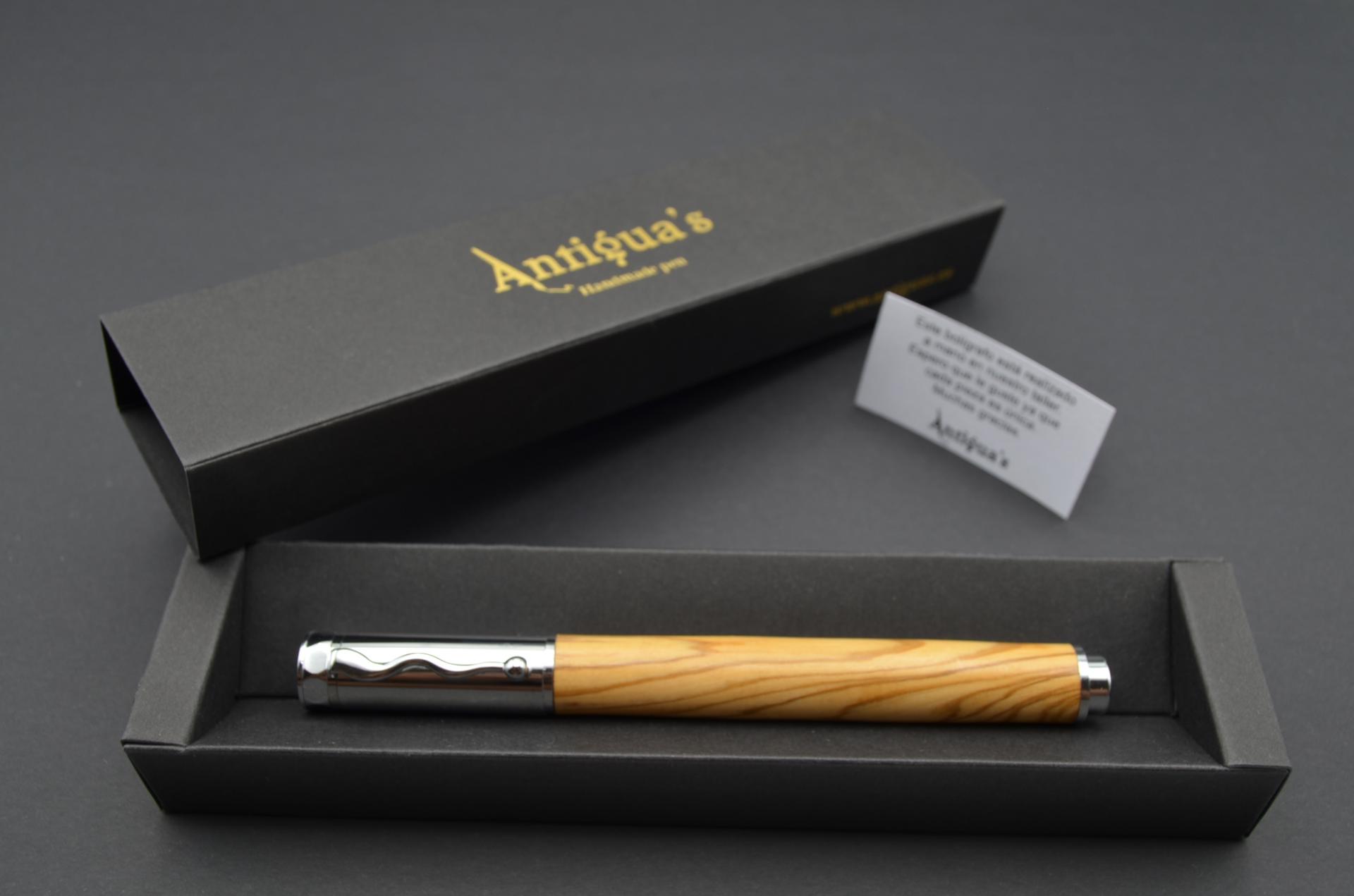 Bolígrafo artesanal torneado a mano con madera de Olivo procedente de España. Cierre Magnético y acabado cromo.