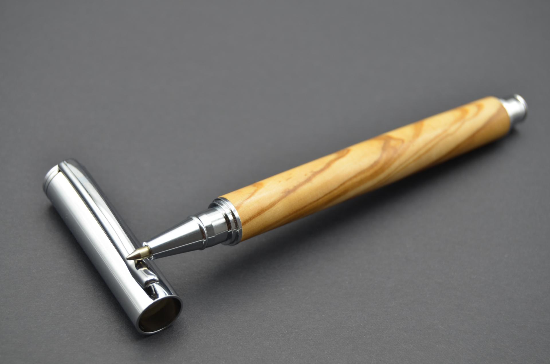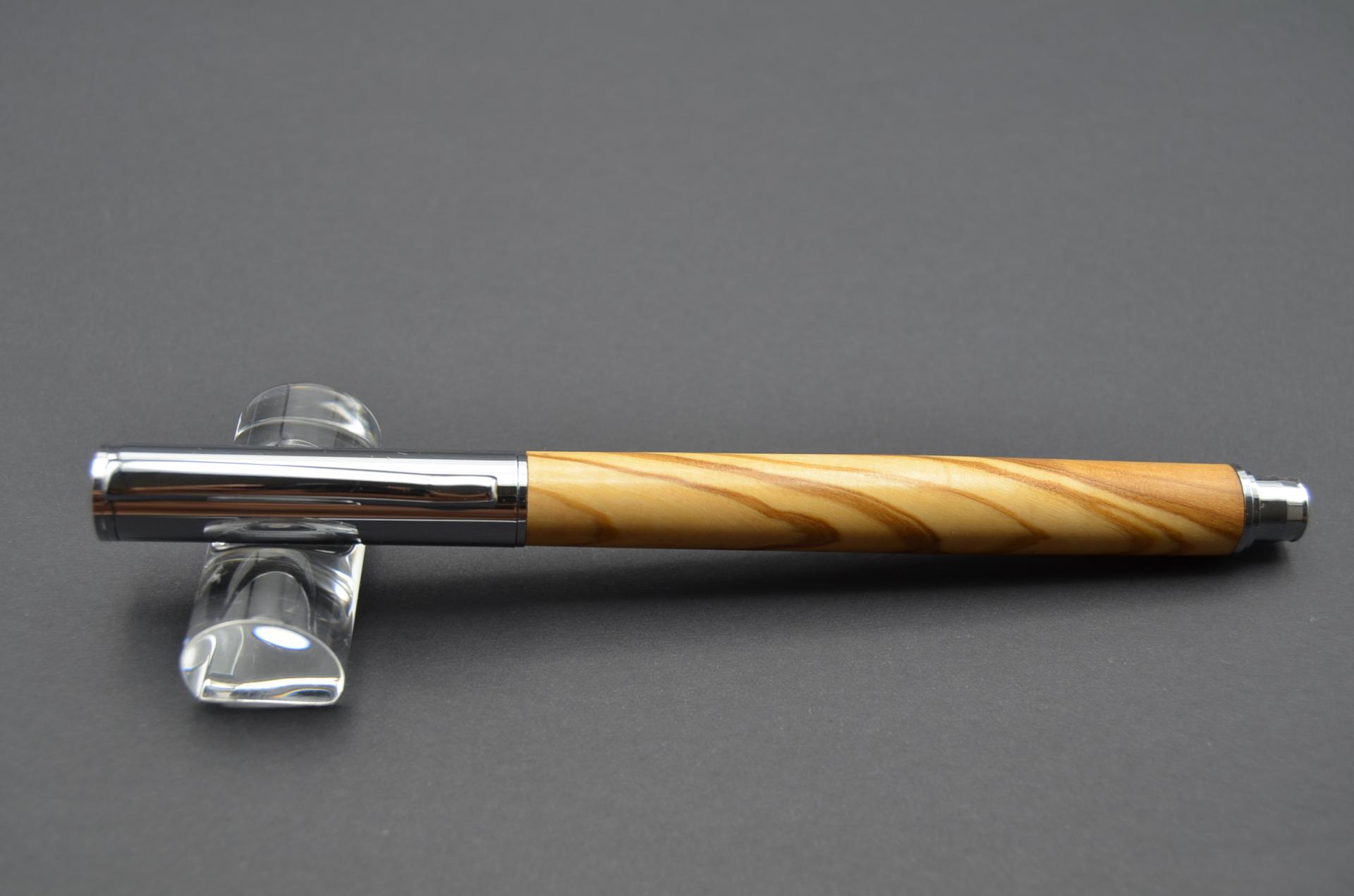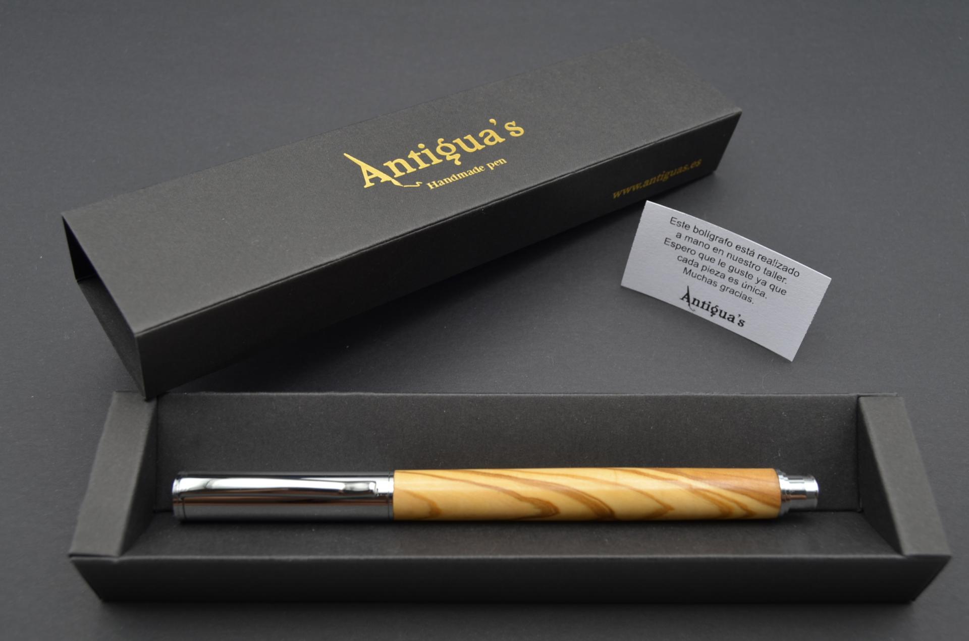Bolígrafo artesanal torneado a mano con madera de Olivo procedente de España. Cierre a presión y acabado cromo.