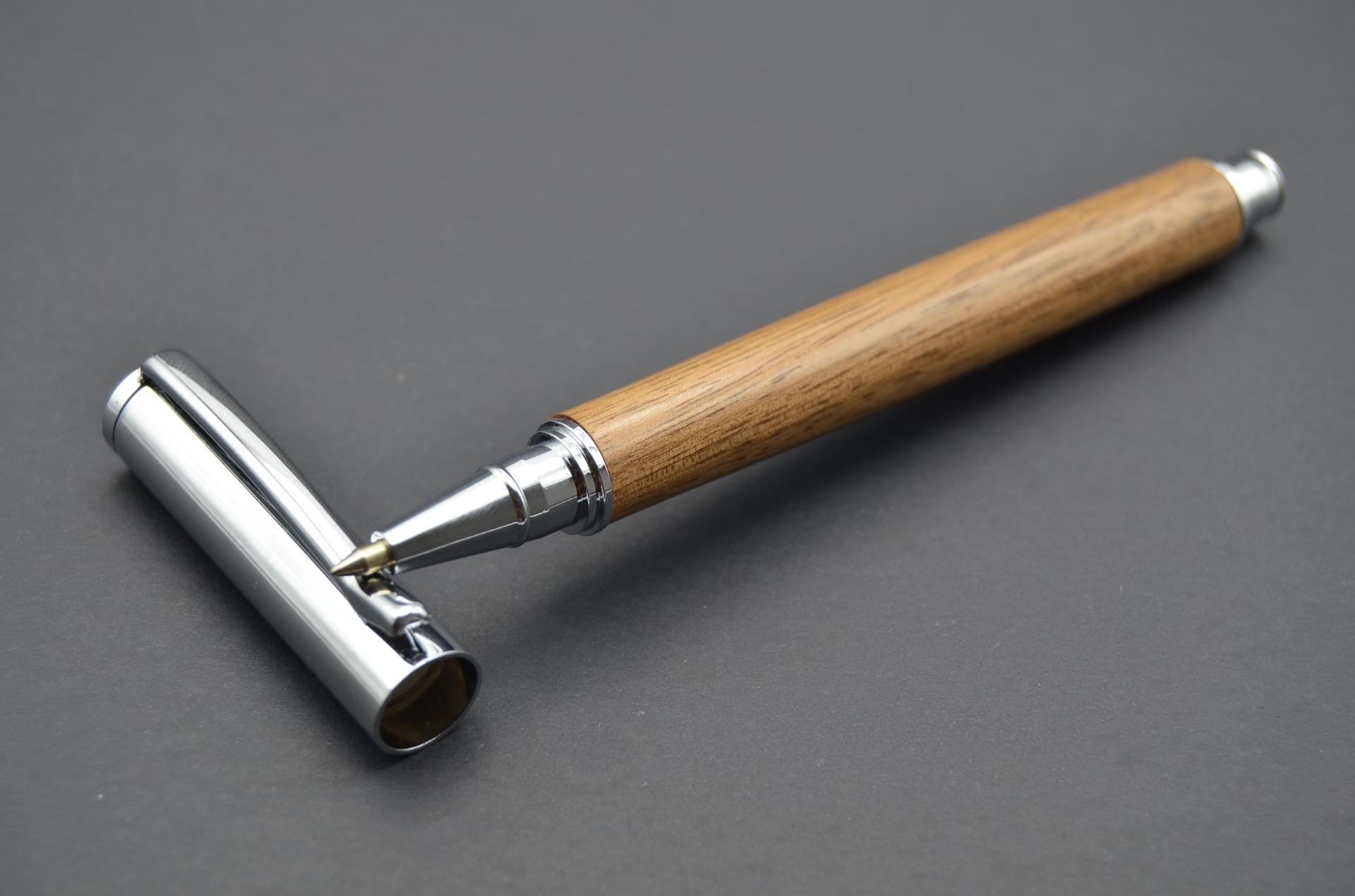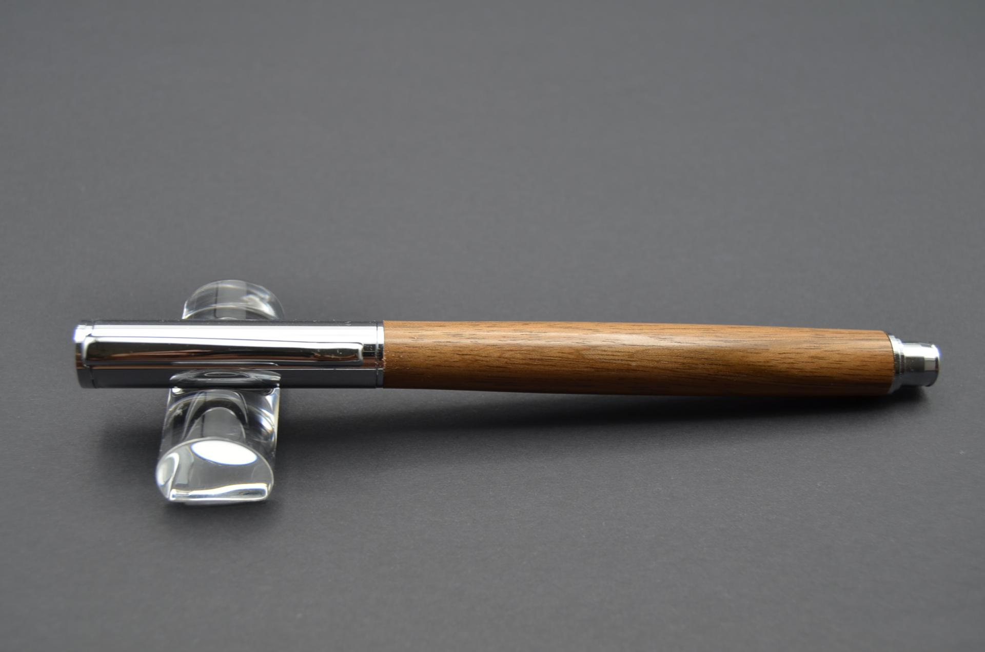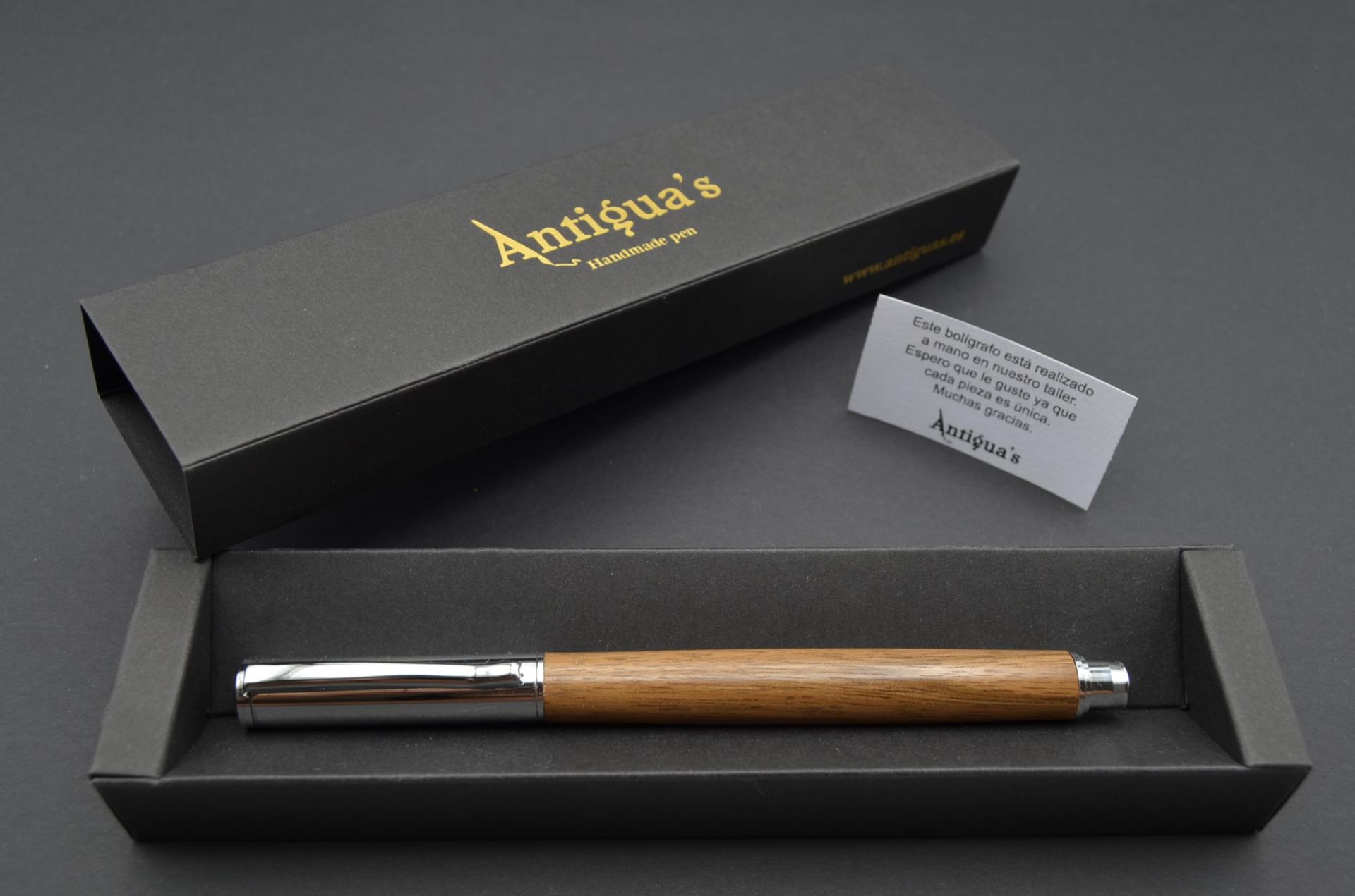 Bolígrafo artesanal torneado a mano con madera de Acacia procedente de Australia. Cierre a presión y acabado cromo.