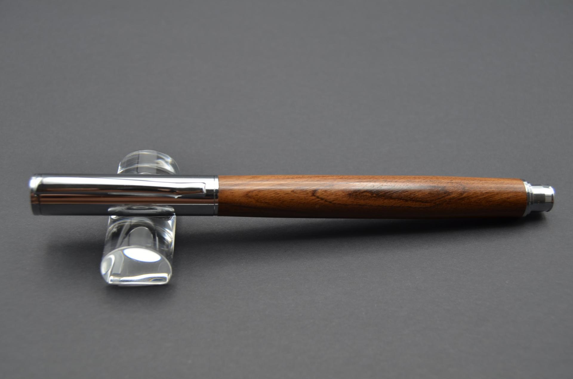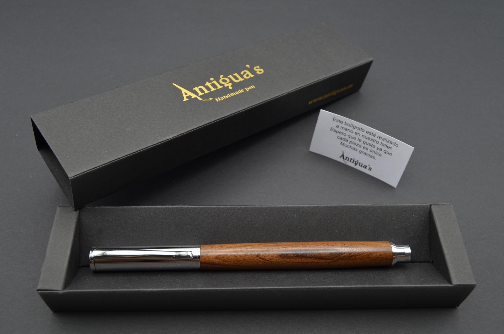 Bolígrafo artesanal torneado a mano con madera de Palo Santo procedente de Brasil. Cierre a presión y acabado cromo.