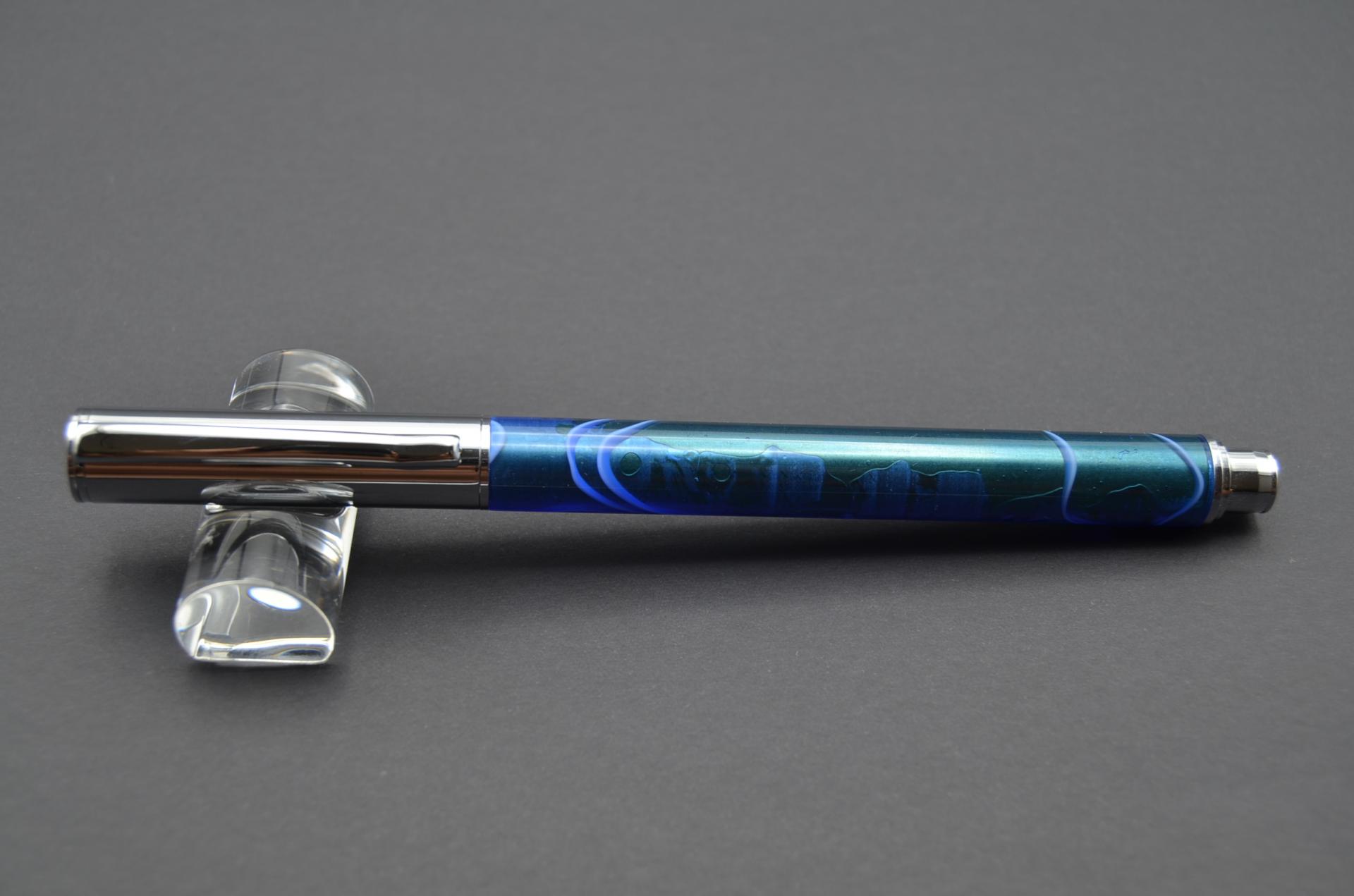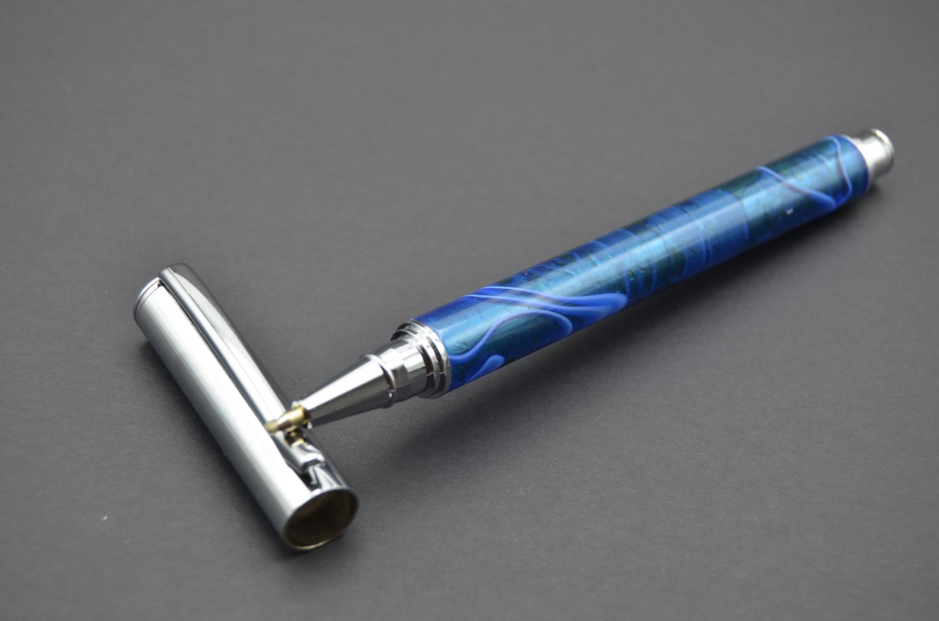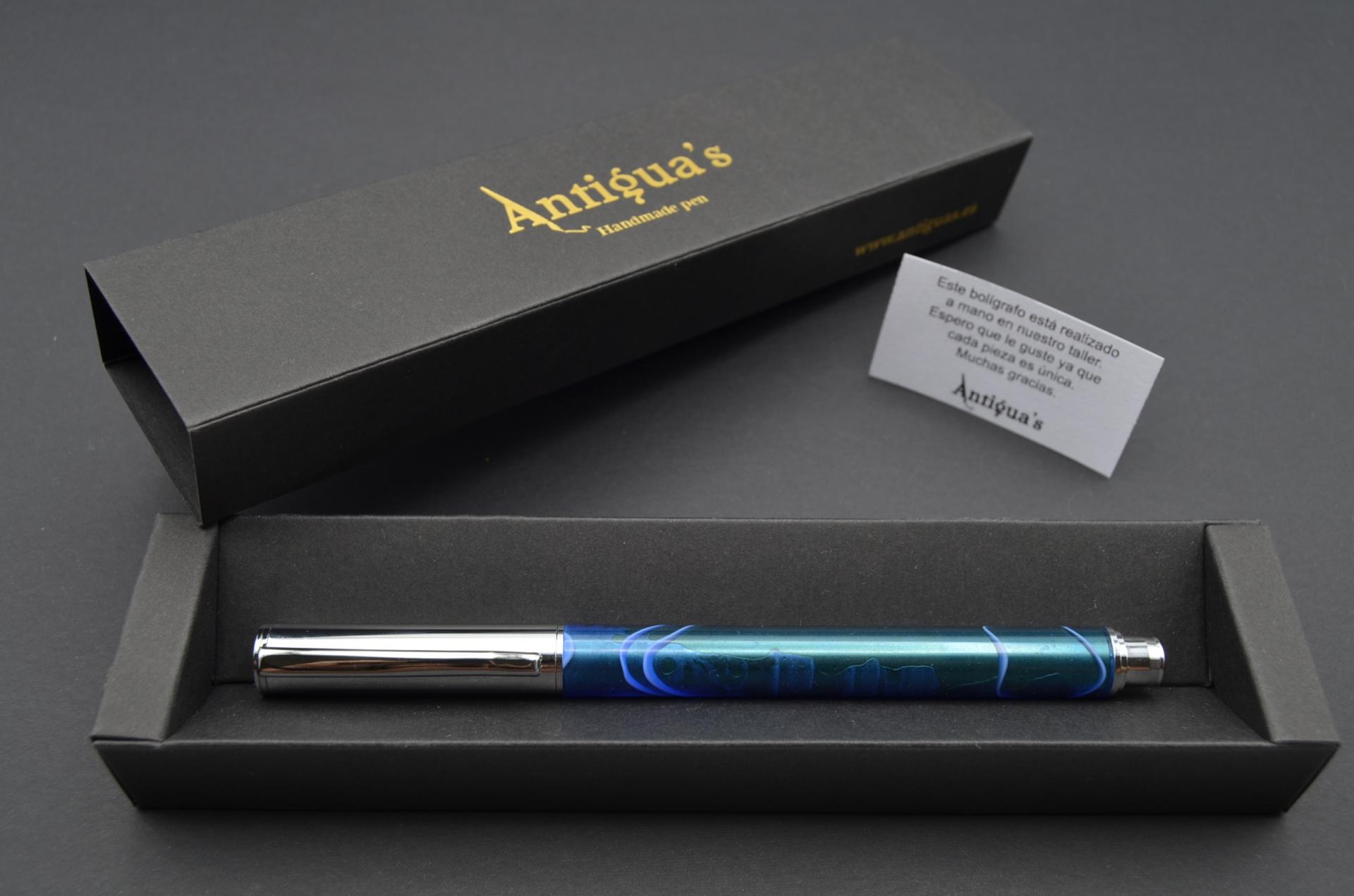 Bolígrafo artesanal torneado a mano con resina acrílica. Cierre a presión y acabado cromo.