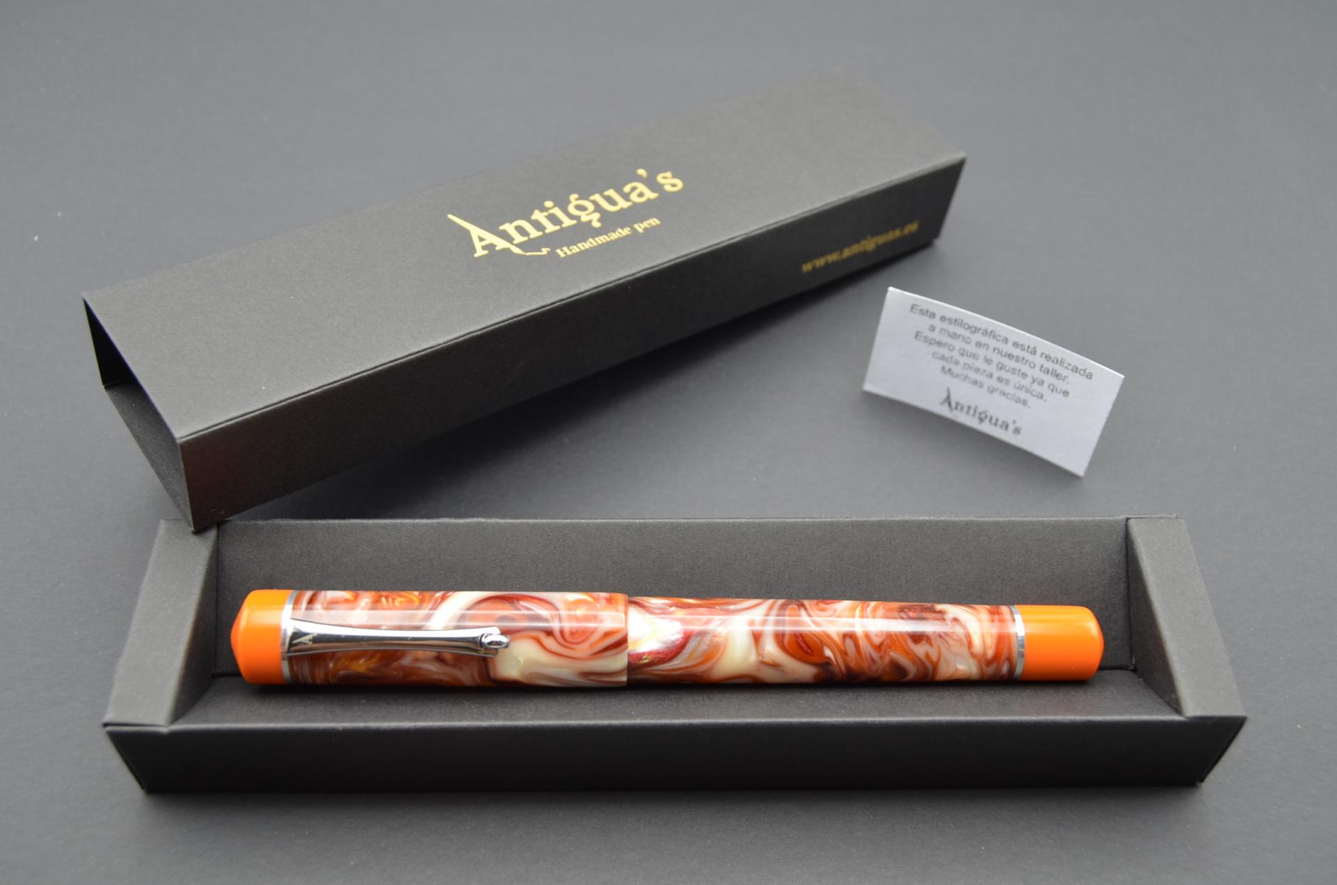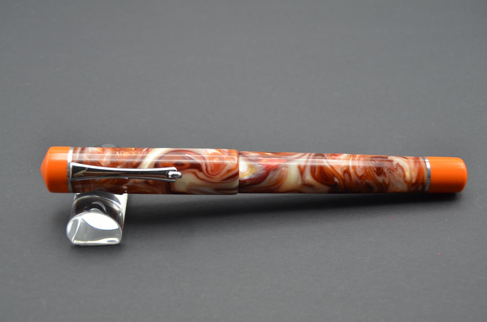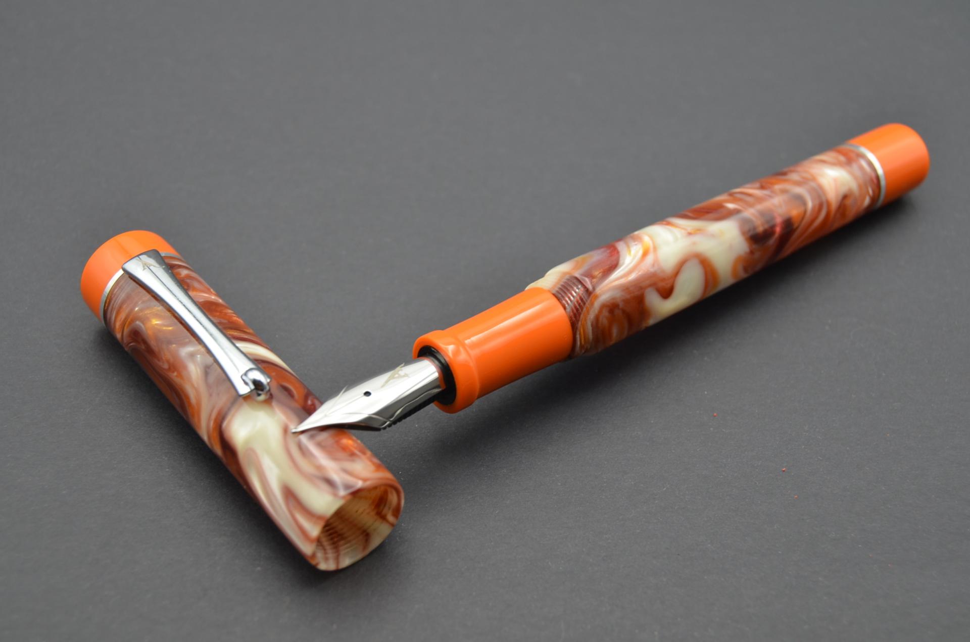 Estilográfica Phoenix torneada a mano con resina acrílica y acetato de celulosa, lleva instalado un plumín JOWO #6 de acero pulido.