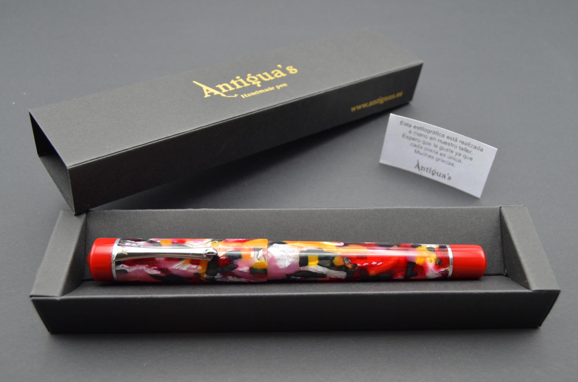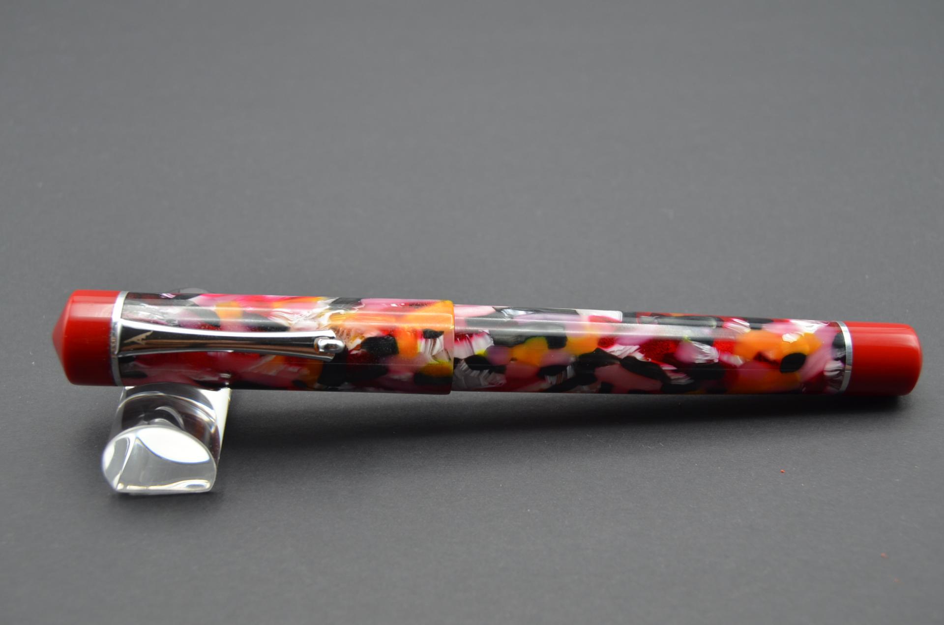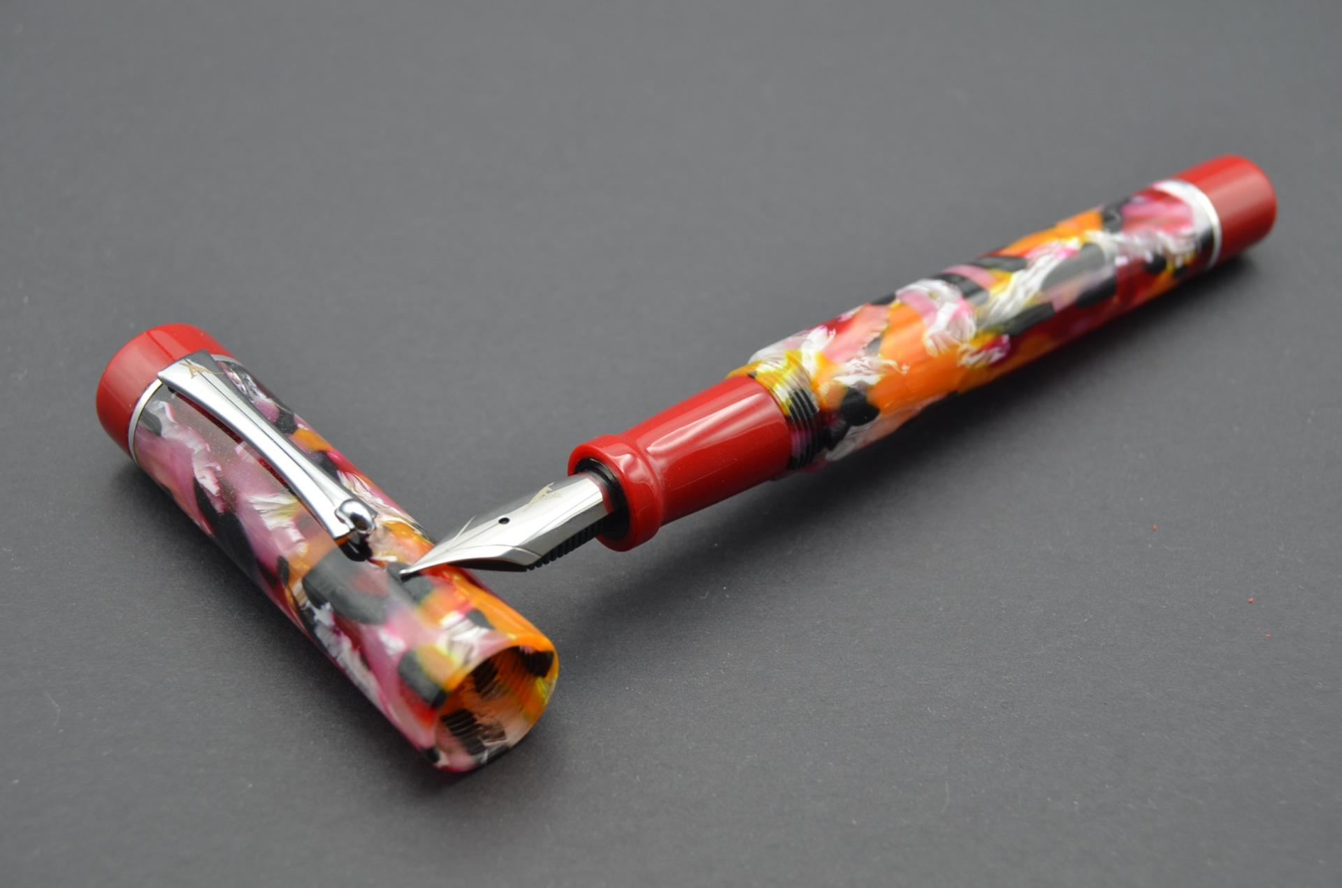 Estilográfica Phoenix torneada a mano con resina acrílica y acetato de celulosa, lleva instalado un plumín JOWO #6 de acero pulido.